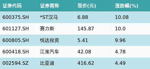南财智讯5月23日电正规炒股在线配资网,天眼查数据显示,今日汽车整车主题走强,截至早盘收盘(下同)上涨3.78%。持有汽车整车主题股票的兴银国证新能源车电池ETF(159767)早盘上涨1.75%,最新价报0.582元。截至上个交易日(5月22日),该基金近五个交易日净值(复权单位净值,下同)上涨2.29%,近一个月净值上涨8.66%。该基金自(20210806)成立以来净值增长率为-42.91%,管理人为兴银基金管理有限责任公司,基金经理为刘帆、翁子晨。截至早盘收盘正规炒股在线配资网,汽车整车主题涨跌幅最高的五只股票为:*ST汉马(600375.SH)、赛力斯(601127.SH)、悦达投资(600805.SH)、江淮汽车(600418.SH)与比亚迪(002594.SZ)。详情见下表: