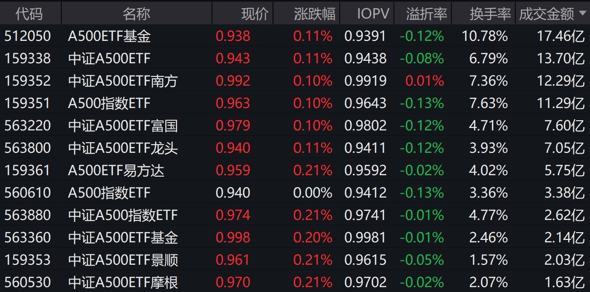 截至上午收盘,场内34只跟踪中证A500指数的ETF小幅上涨,其中有12只中证A500相关ETF成交额超1亿元,4只超11亿元,A500ETF基金、中证A500ETF、中证A500ETF南方早盘成交额分别为17.46亿元、13.7亿元、12.29亿元。