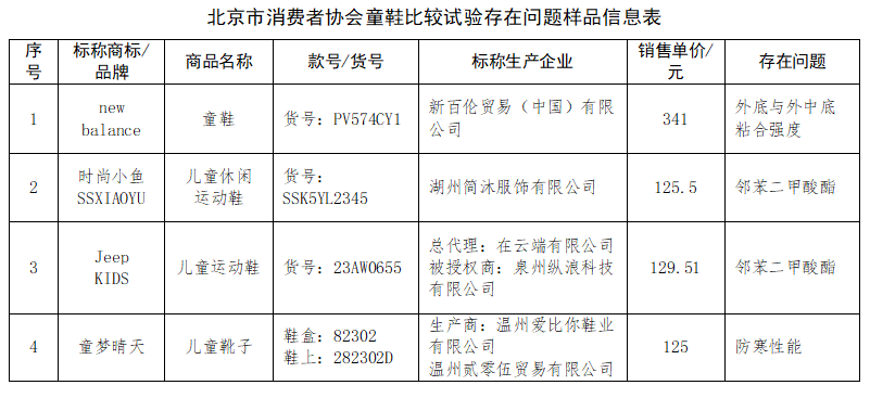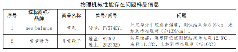 物理机械性能即鞋子的服用性能,体现了鞋子的穿着耐用性和舒适性,物理机械性能不符合,不仅影响产品的正常穿着和使用寿命,也会带来安全隐患和影响健康。本次比较试验中,15件有测试外底和外中底粘合强度的样品中,new balance牌样品的鞋底粘合强度存在问题。2件雪地靴样品中,童梦晴天牌样品的防寒性能测试结果存在问题。