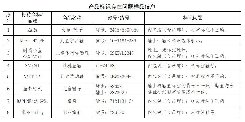 产品标识是指导消费的重要参数,消费者据此可以大致了解产品的材质、品质、规格、生产企业、使用和维护注意事项等。依据QB/T2673-2023规定,产品标识应包括:商标、产品名称、鞋号、材质、产地、企业名称及联系方式、执行标准编号、货号、质量等级等信息。每只鞋上应至少标注商标或企业名称、鞋号、货号(凉、拖鞋除外)。产品标识应如实地介绍产品并反映产品的真实属性。鞋、包装(含吊牌)等不同位置上的标识,同一要素的内容应一致。本次比较试验中,ZARA、MiKi HOUSE、时尚小鱼SSXIAOYU、SATCHI、NAUTICA、童梦晴天、DAPHNE/达芙妮、米菲miffy等8件样品存在标注信息缺失、错误、不一致等问题。